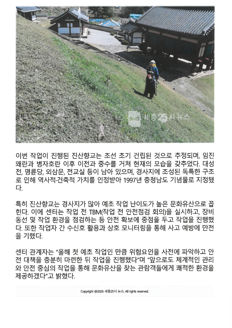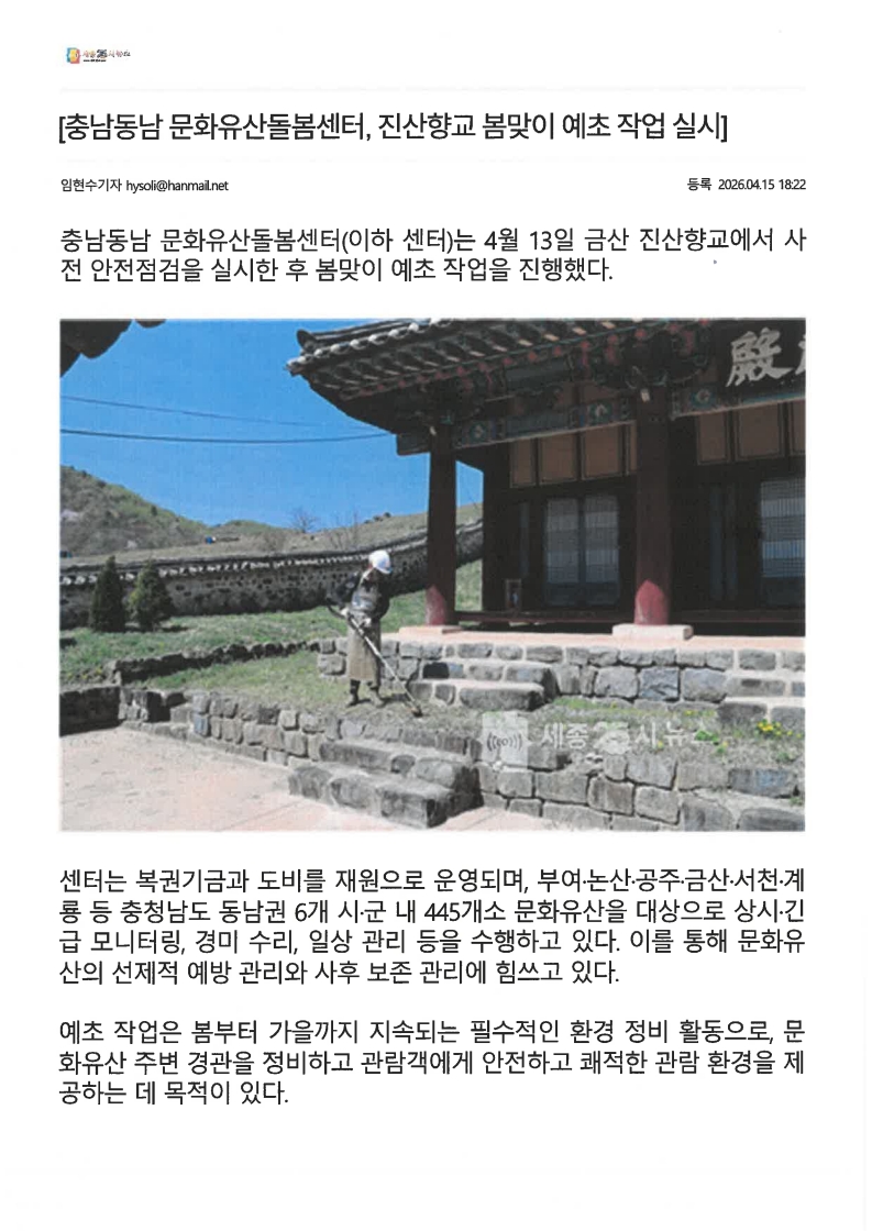 [보도자료] 충남동남 문화유산돌봄센터, 진산향교 봄맞이 예초작업 실시!