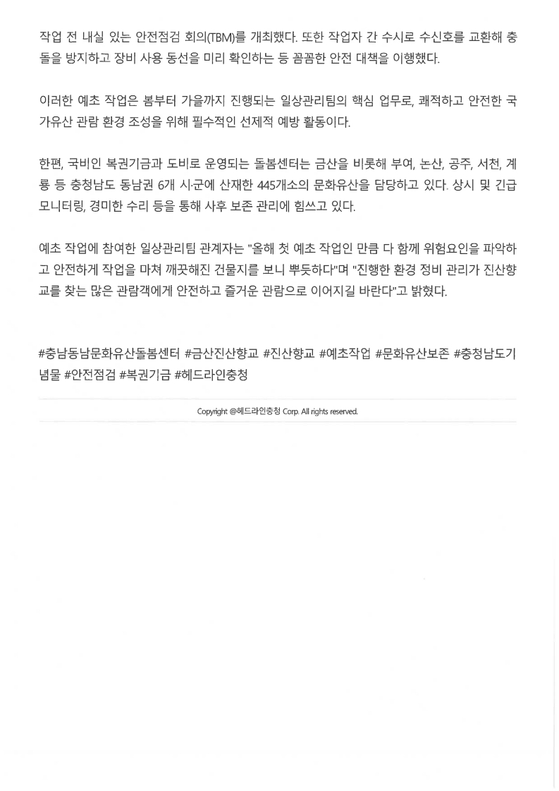[보도자료] 금산 진산향교서 쾌적한 관람 준비 끝... 충남동남센터 예찰 활동 빛났다