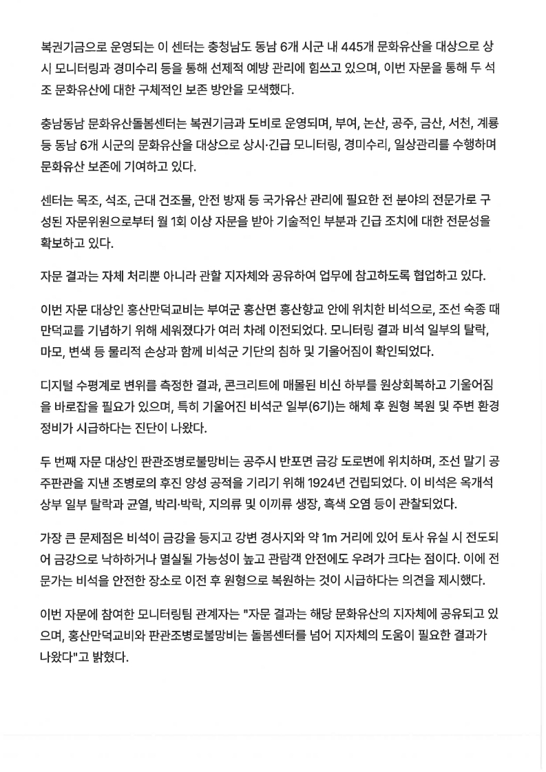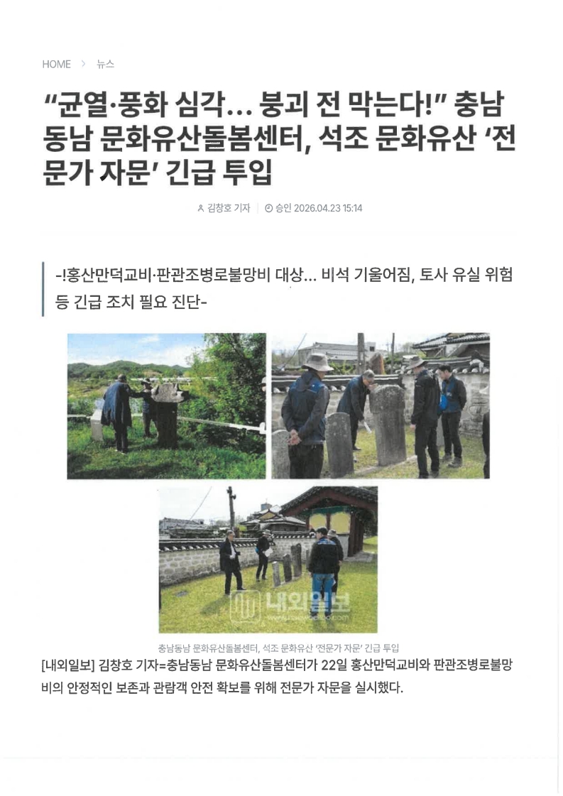 [보도자료] “균열·풍화 심각… 붕괴 전 막는다!” 충남동남 문화유산돌봄센터, 석조 문화유산 ‘전문가 자문’ 긴급 투입