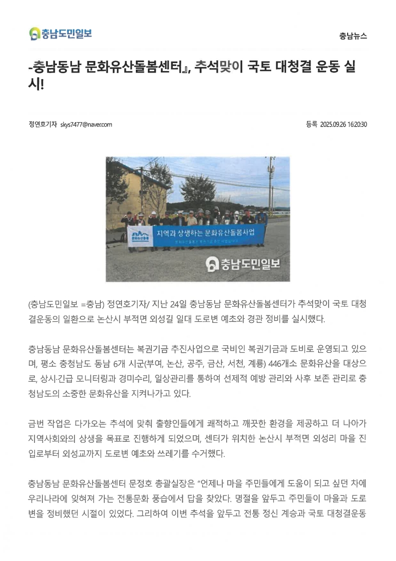 [보도자료] 충남동남 문화유산돌봄센터, 추석맞이 국토 대청결 운동 실시!