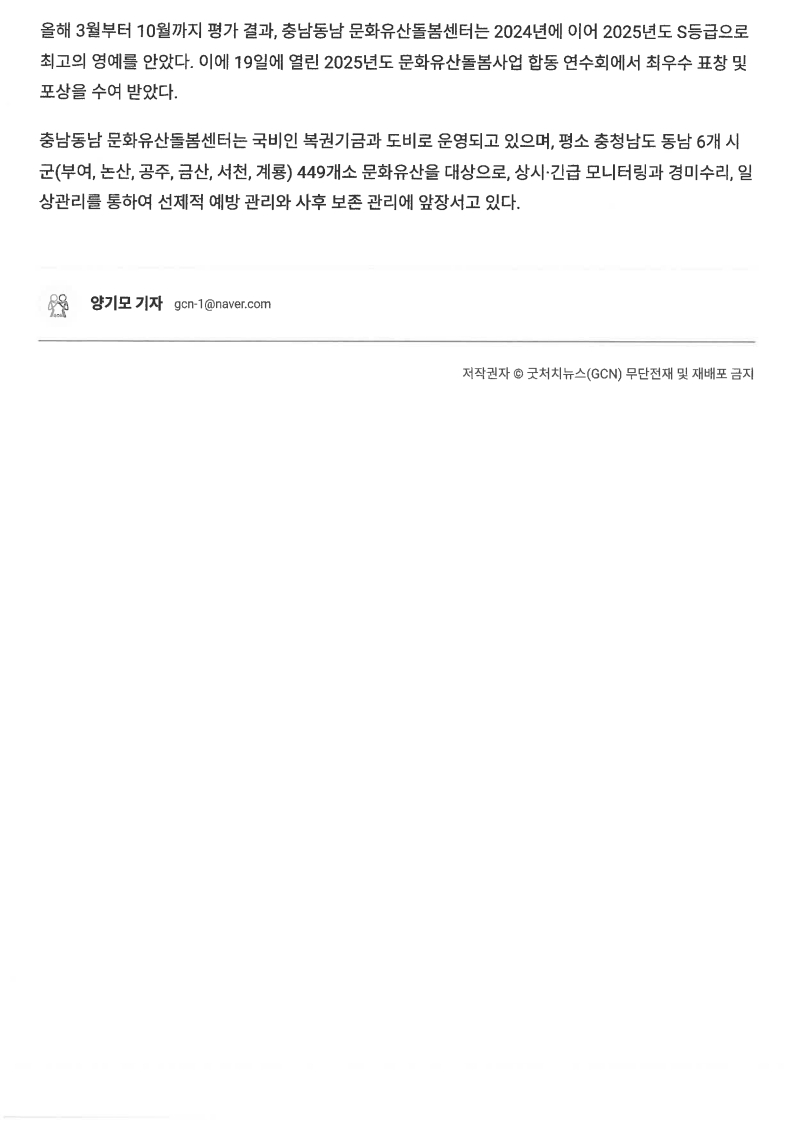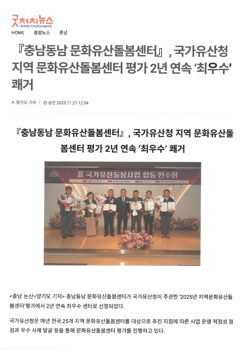 [보도자료] 충남동남 문화유산돌봄센터, 국가유산청 지역 문화유산돌봄센터 평가 2년 연속 '최우수' 쾌거