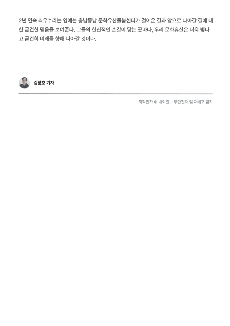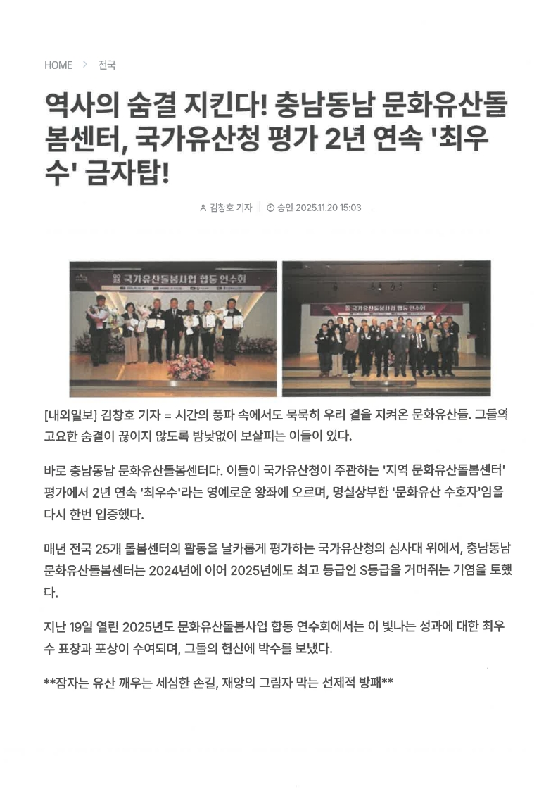 [보도자료] 충남동남 문화유산돌봄센터, 역사의 숨결 지킨다! 충남동남 문화유산돌봄센터, 국가유산청 평가 2년 연속 '최우수' 금자탑!