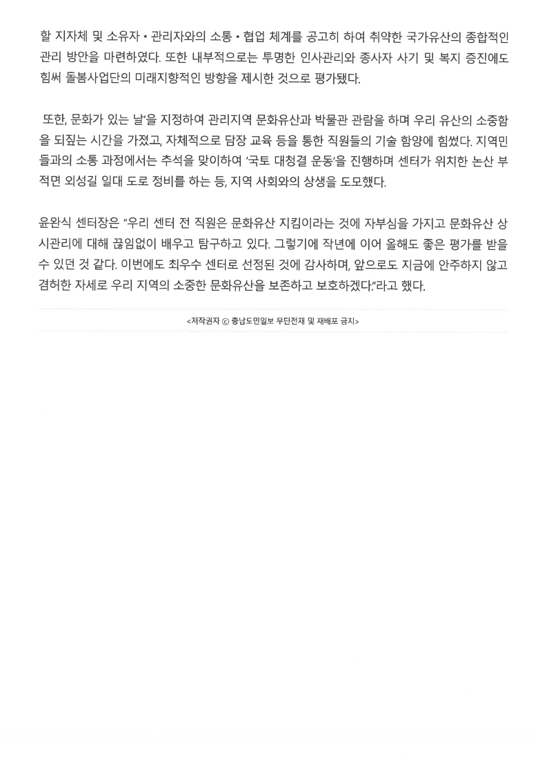[보도자료] 충남동남 문화유산돌봄센터, 국가유산청 지역 문화유산돌봄센터 평가 2년 연속 '최우수' 쾌거!