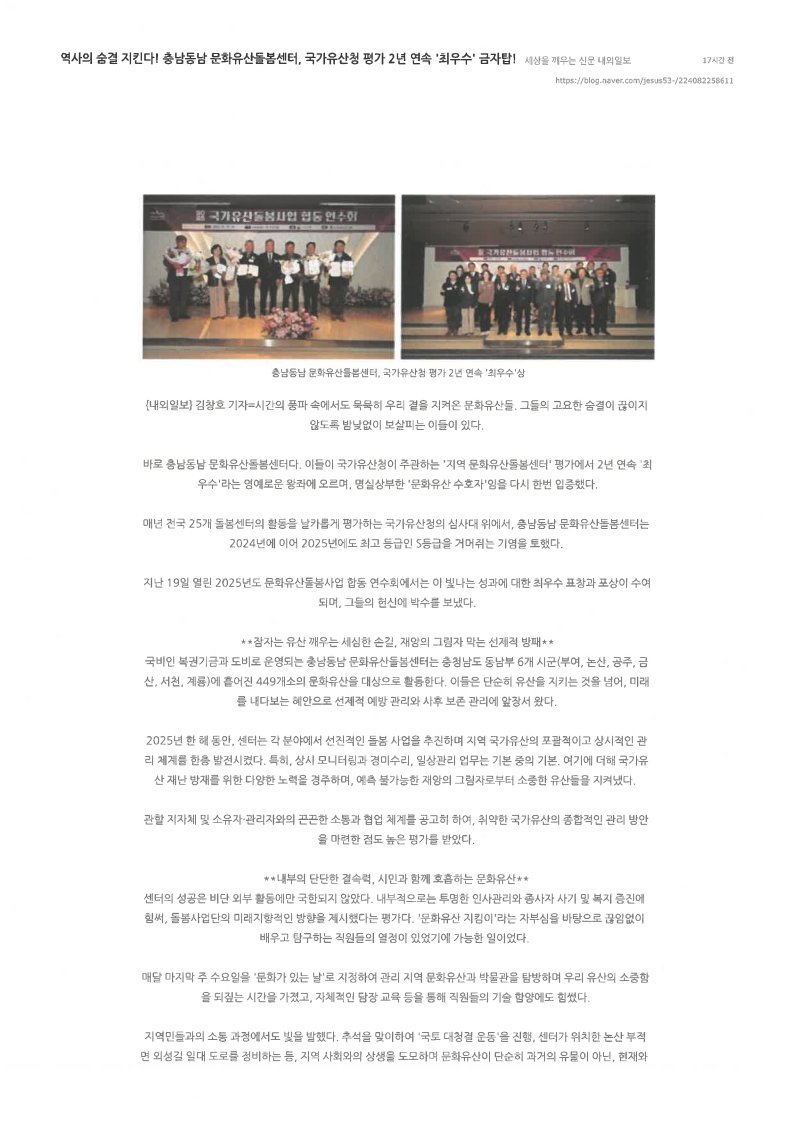 [보도자료] 충남동남 문화유산돌봄센터, 역사의 숨결 지킨다! 충남동남 문화유산돌봄센터, 국가유산청 평가 2년 연속 '최우수' 금자탑!