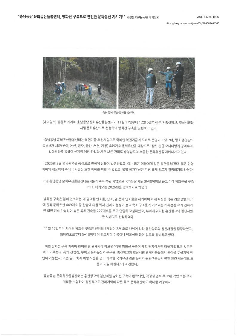 [보도자료] 충남동남 문화유산돌봄센터, 방화선 구축으로 안전한 문화유산 지키기!
