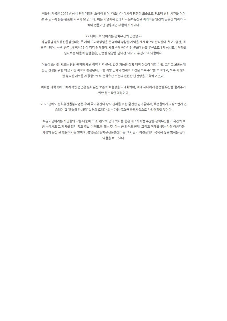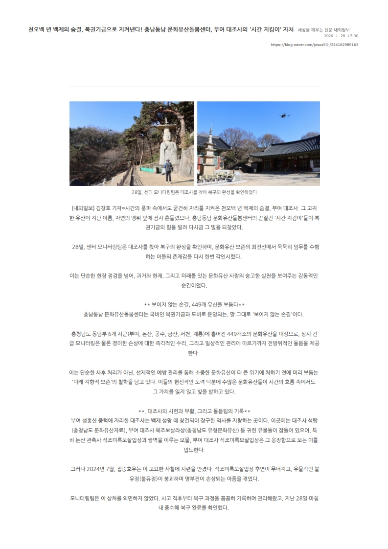 [보도자료] 천오백 년 백제의 숨결, 복권기금으로 지켜낸다! 충남동남 문화유산돌봄센터, 부여 대조사의 '시간 지킴이' 자처