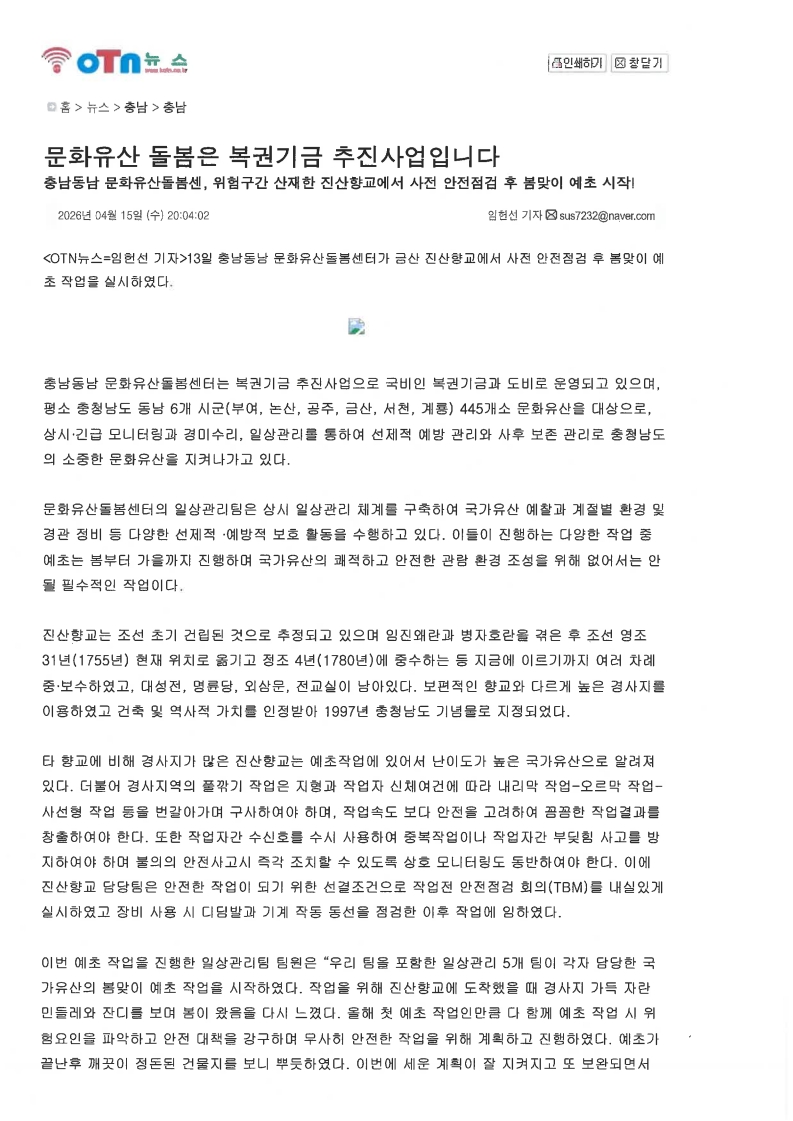 [보도자료] 충남동남문화유산돌봄센터, 위험구간 산재한 진산향교에서 사전 안전점검 후 봄맞이 예초 시작!