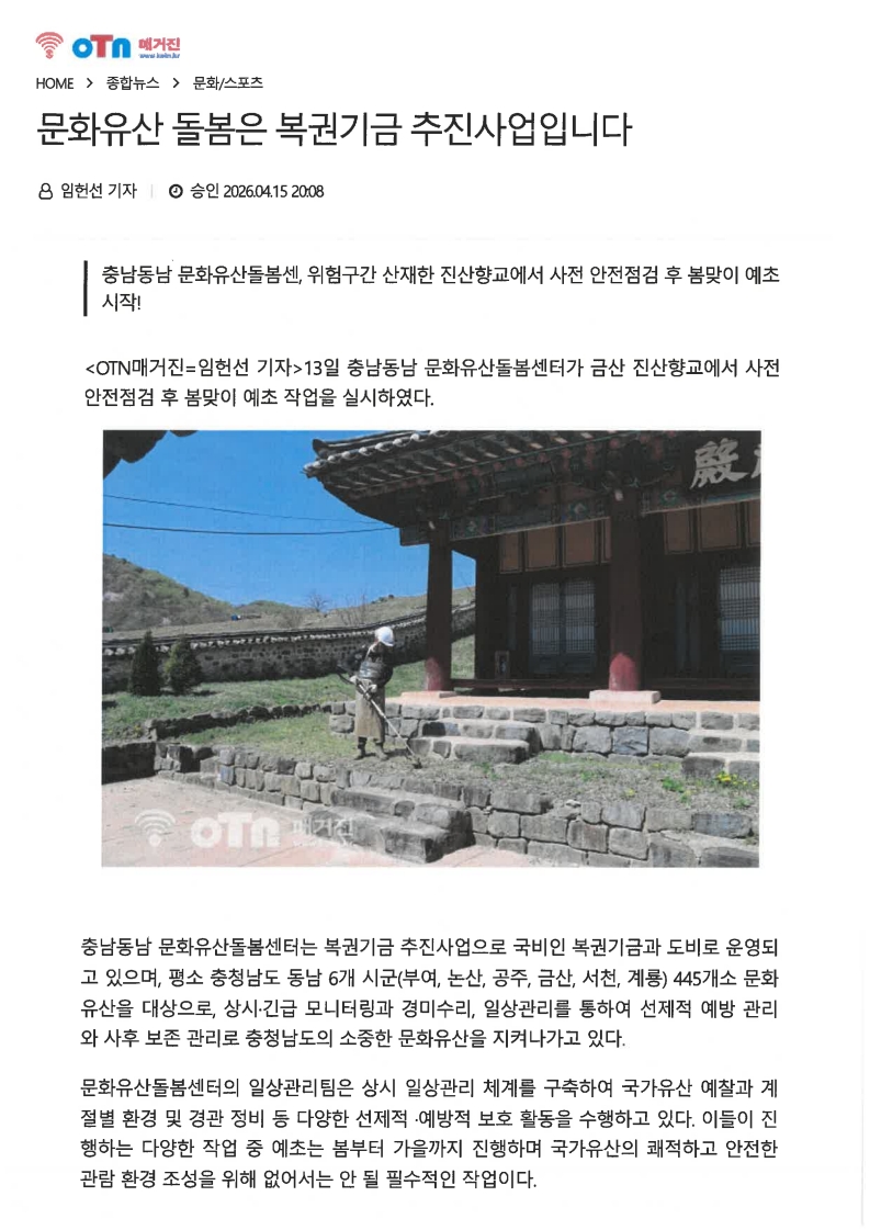 [보도자료] 충남동남 문화유산돌봄센터, 위험구간 산재한 진산향교에서 사전 안점점검 후 봄맞이 예초 시작!
