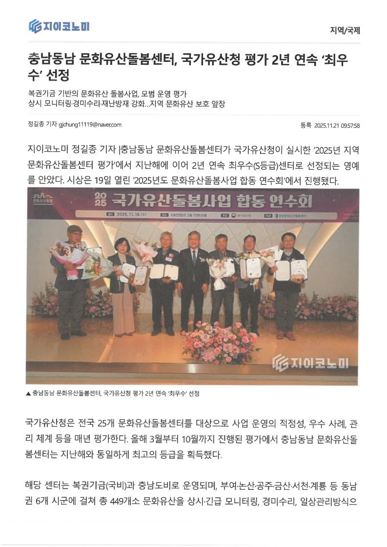 [보도자료] 충남동남 문화유산돌봄센터, 국가유산청 평가 2년 연속 '최우수' 선정