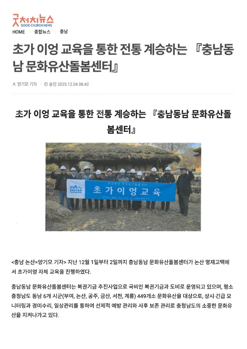 [보도자료] 초가 이엉 교육을 통한 전통 계승하는, 충남동남 문화유산돌봄센터